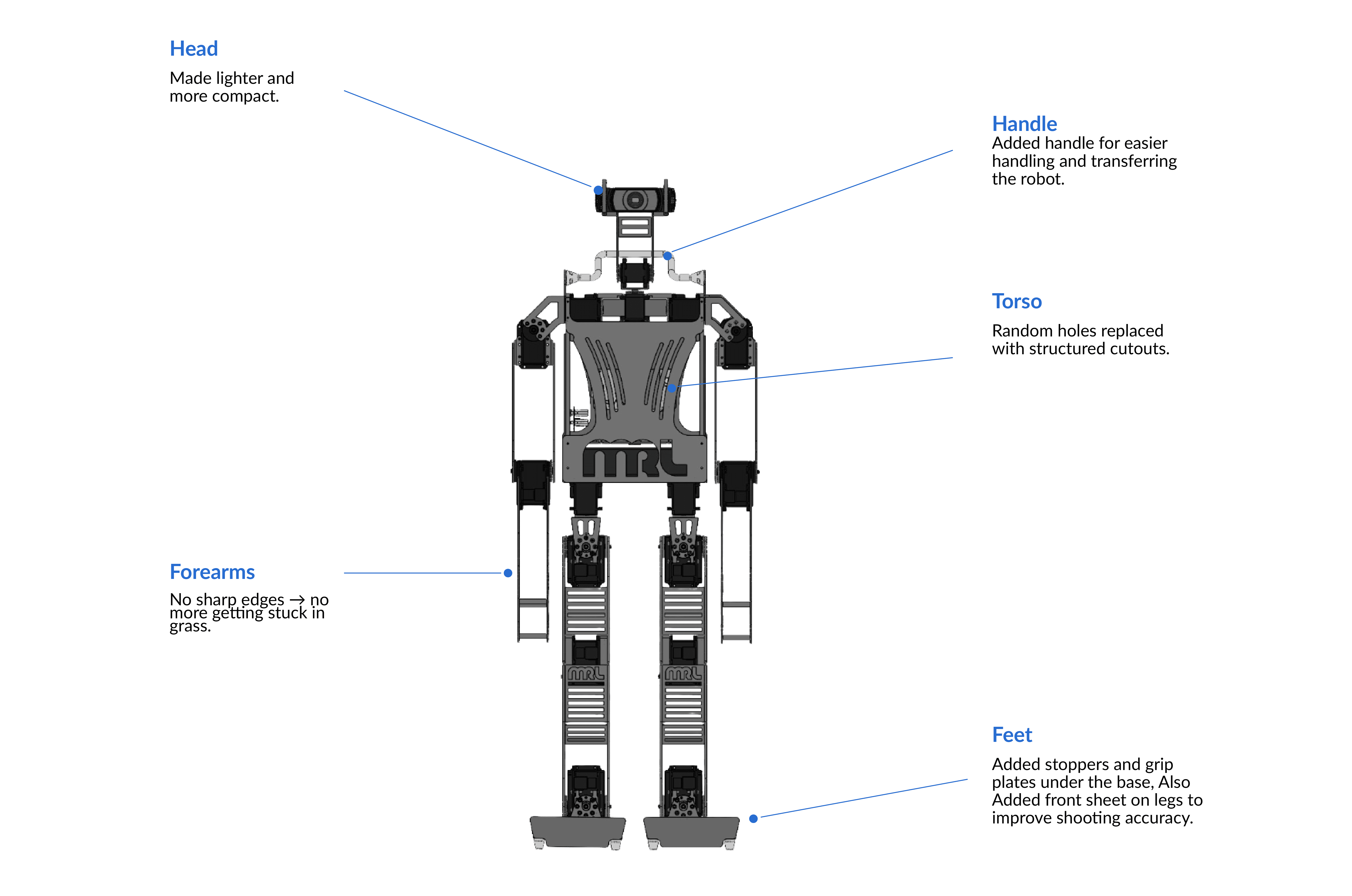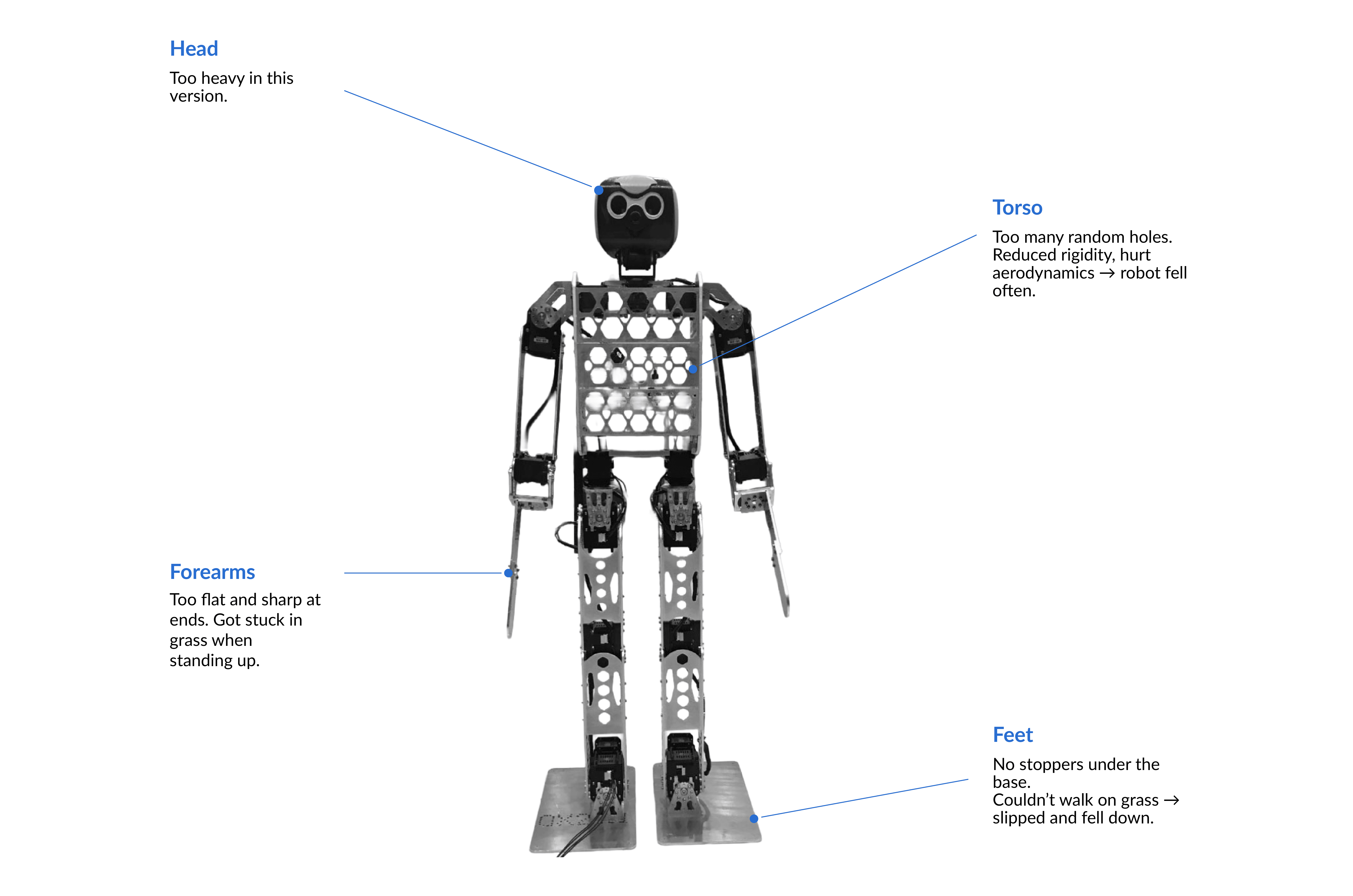 The kid-size platform gave us a clear baseline for joint alignment, actuator range, and overall body proportions. Analyzing its performance on grass, weight distribution, and kicking stability helped define the mechanical requirements for the teen-size robot.